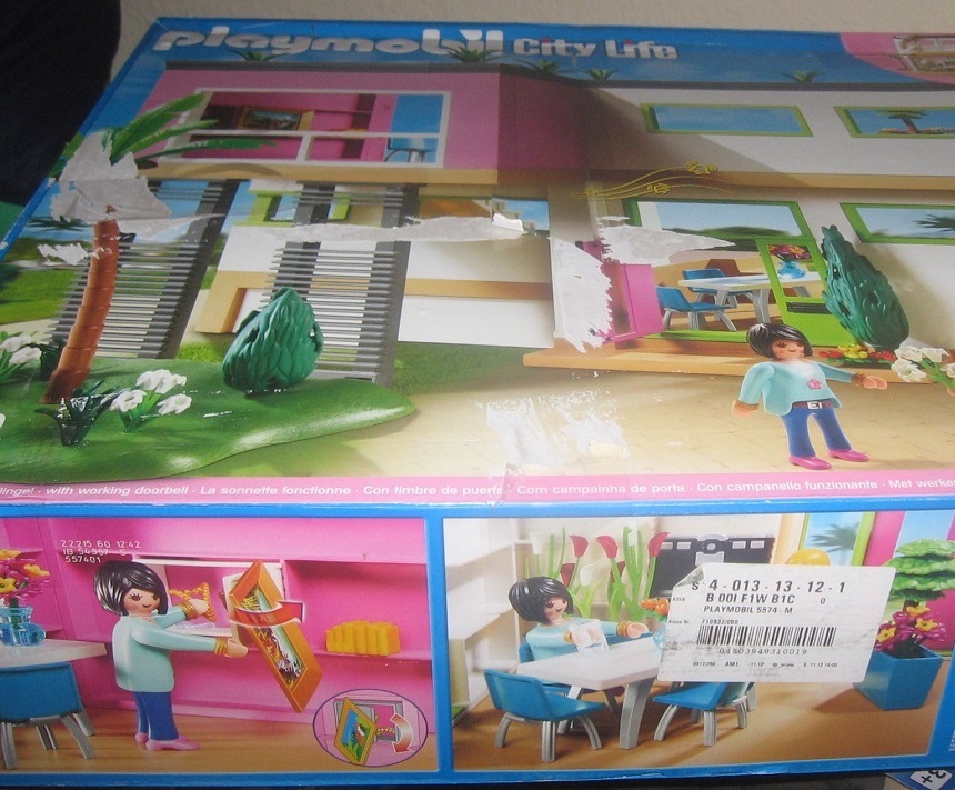 so nun mal Bilder vom Karton .Der ist zwar etwas ruiniert aber zur Aufbewahrung der Villa reicht es uns ja.Da es uns ja nur auf den Inhalt ankam und der ist bei uns eh nie lange MIB .