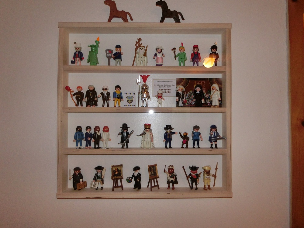 Da sollte doch in jedes Fach ein Männchen passen. Außerdem kann man ja die Einlegeböden variabel gestalten und zur Not einen weglassen, falls man Männchen auf Pferden reinstellen möchte.