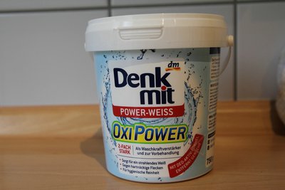 Als ich leider bei Aldi nicht fündig würde,bin ich in den DM Drogerie Markt.Die Preise für das Vanish Oxi waren mir zu hoch,also habe ich mich für die Hausmarke entschieden. Damit nach Hause und einen Eimer und ein Versuchsteil gesucht. Nun ging es an das Mischungsverhältnis.....laut Tipp war es die Vierfache Menge....