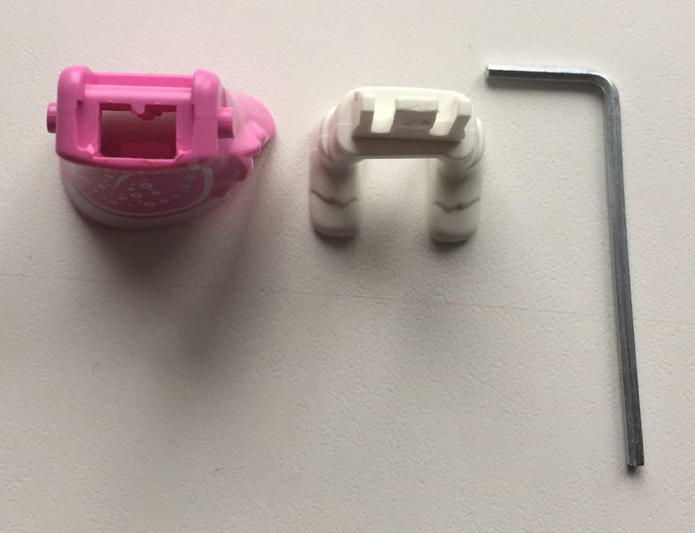 Wenn du von oben auf den Rock mit den eingeklipsten Beinen schaust, musst du den mittleren weißen Teil der Beine so weit wie möglich nach hinten drücken, dann lösen sie sich. Als Werkzeug habe ich einen kleinen Inbusschlüssel verwendet.
