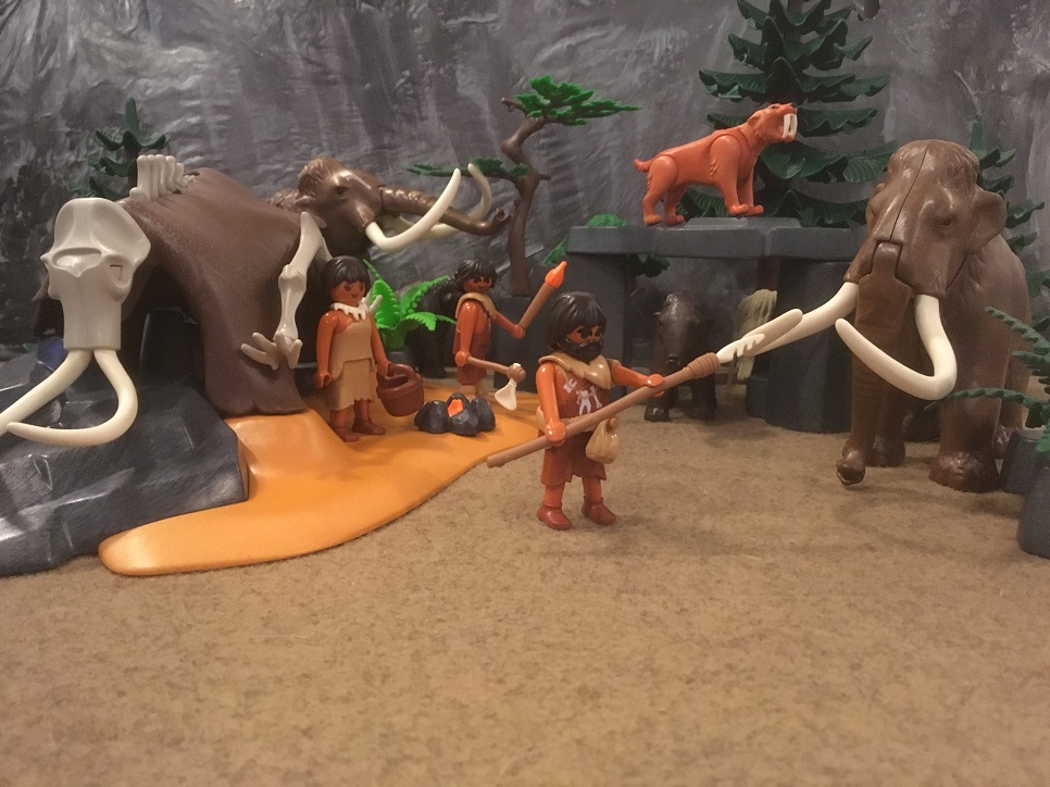 Aufgestellt haben wir eine kleine Gruppe Steinzeitjäger. Sie haben kein festes Zuhause hier sondern ziehen von Ort zu Ort, dahin wo die Mammuts sind Ein Mammutfell wurde schnell über ein paar Knochen gespannt, die man in Steinwänden verkeilt hat. Die Felsen drumrum bieten einen kleinen natürlichen Schutz gegen den gröbsten Wind und die Bodenfeuchte. Es ist wohl insgesamt eher etwas wärmer und feuchter hier als es heute ist. Die Leute sind eigentlich nur draussen, ihre Haut ist wettergegerbt und braungebrannt. Mit ihren recht primitiven Waffen haben sie es geschafft sich die Mammuts hier als so etwas wie halbwilde Nutztiere zu halten. Aktuell droht ein Säbelzahntiger dieses unstete Gleichgewicht aus dem Ruder zu werfen und muss deshalb vertrieben werden. Die beiden Männer der Gruppe schicken sich an durch rufen, fuchteln mit den Waffen und einer Fackel eben das zu tun...