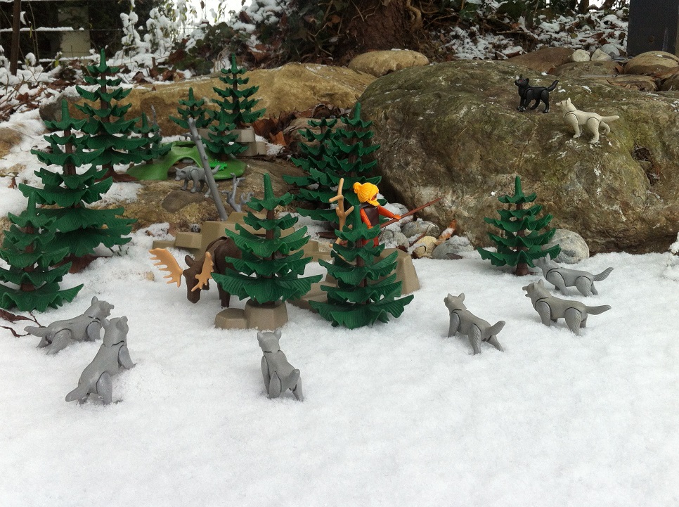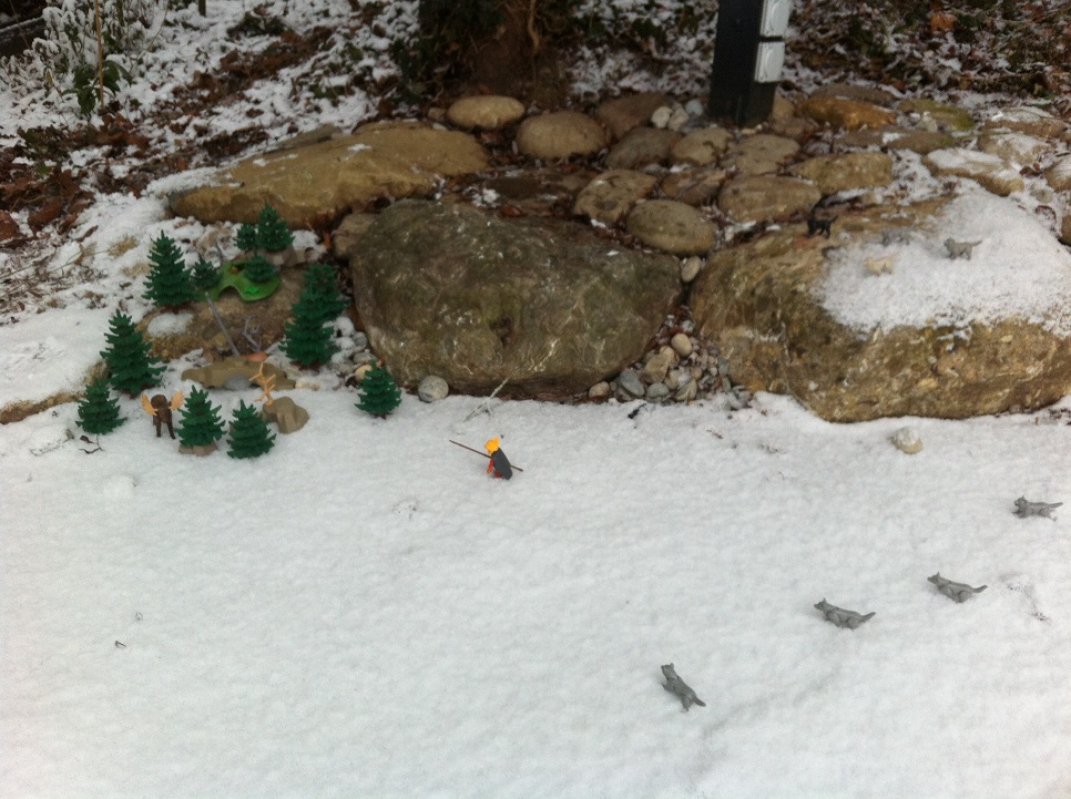 Zurück zu dem kleinen Bergsee - hier ist er im Bild, tief verschneit und zugefroren. An seinem flachen Ende wäre eigentlich ein Sumpf- und Moorgebiet, aber auch das ist unter der Schneedecke nicht zu erkennen: Dafür ist da was anderes... mitten auf dem See... wir schauen mal genauer hin, er ist gekleidet wie ein Jäger, dick eingemummelt in einen Pelzumhang. Die Gamaschen aus Fell sind bis an die Knie geschnürt. Um den Hals trägt er eine Kette aus Bärenklauen. Den wilden Haarschopf hat er sich hinten am Kopf zusammengebunden, damit er bei dem Wind nicht mit einem natürlichen Vorhang ausgestattet durch die Lande streifen muss. Ein Holzspeer und ein einfaches Messer, sowie ein kleiner Beutel, der eigentlich getrocknete Früchte und Beeren sowie vielleicht ein, zwei gedörrte Fleischstreifen enthalten sollte machen seine Ausrüstung komplett: Genau - ein Mensch. Riko um genauer zu sein. Nachdem er von Süden über die Alpen gekommen ist und sich durch bisher unbekannte Höhen, Gletscherspalten und andere Gefahren gekämpft hat, sieht er müde und hungrig aus. Er schnauft feste. Sitzen ihm die Anstrengungen des langen Marsches noch so in den Knochen? Nein - der ist sogar ganz ausser Puste. Der ist gerannt. Jetzt hält er einen Moment inne und schaut sich um: Hinter ihm schon ganz nah ist Wolfsgeheul zu hören. Nichts wie weiter, die Verfolger sind schon nah. Da drüben am Ufer ist ein Wäldchen, das könnte die Rettung sein - oder zumindest besser als die freie Fläche auf der sich unser Riko im Moment bewegt: Aber da ist schon wer in dem Wäldchen. Ein riesiger Elch war ans Ufer gekommen um zu trinken. Das Ufer ist steil, weshalb man als Elch an dieser Stelle mit den Vorderhufen ein Loch in Ufernähe ins Eis stampfen konnte - es ist eine der Ablaufstellen des Sees. Dumm nur, dass der Wind die Geräusche und Gerüche bisher vom Elch weggetragen hat. Jetzt hört und riecht und sieht er die Gefahr die sich nähert in Form von sowohl Mensch als auch Wolf. Die steile Uferböschung hinauf ist bei dem Schnee keine gute Idee. Der Weg am Rand entlang, den er gekommen ist, hiesse sich direkt gegen die Phalanx der Wölfe zu stemmen. Unsicher senkt er den Kopf und wartet ab: Riko erreicht das Wäldchen - sieht den Elch - dieser wiegt unruhig den Kopf hin und her. Kurzentschlossen machen die beiden gemeinsame Sache und stellen sich als unübliches Duo gegen das anrückende Wolfsrudel...