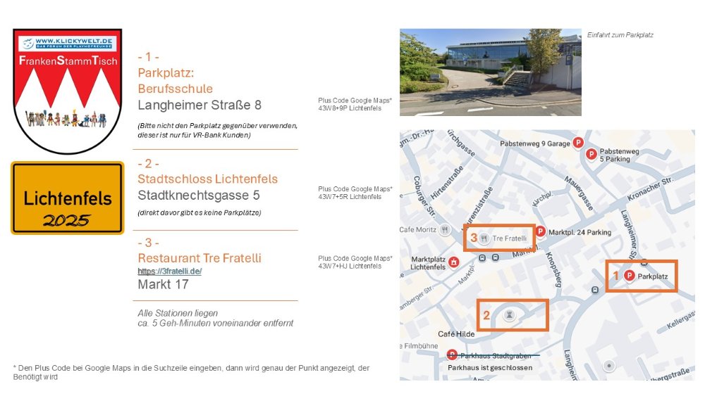 wir freuen uns, euch zum diesjährigen FrankenStammTisch in Lichtenfels begrüßen zu dürfen. Hier findet ihr alle wichtigen Informationen zum Ablauf des Treffens: