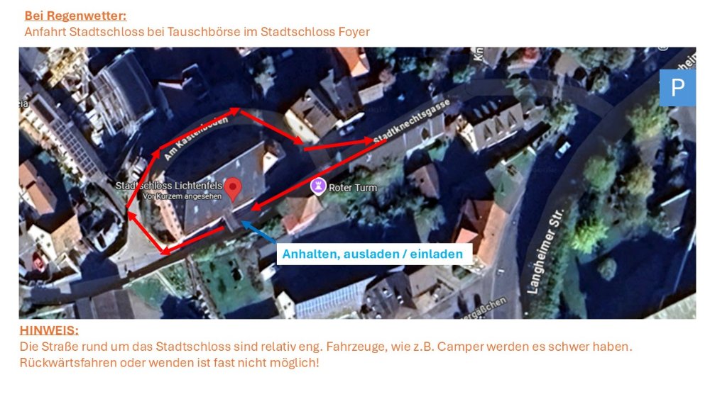 :regen Bei Regenwetter: Die Tauschbörse kann alternativ im Foyer des Stadtschlosses stattfinden. Es ist möglich, mit dem Auto direkt bis zur Eingangstür zu fahren, die Sachen dort auszuladen und anschließend zum Parkplatz zurückzufahren. Das spätere Einladen funktioniert auf gleichem Weg. Beginn ist hier allerdings erst ab 13:00 Uhr möglich.