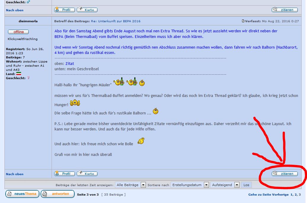 Hallihallo,dieimmerla hat geschrieben: P.S.: Lebe gerade meine bisher unentdeckte Unfähigkeit Zitate vernünftig einzufügen aus. Daher verzeiht mir das unschöne Layout. Ich kann nur besser werden. Und auch da für jede Hilfe offen.