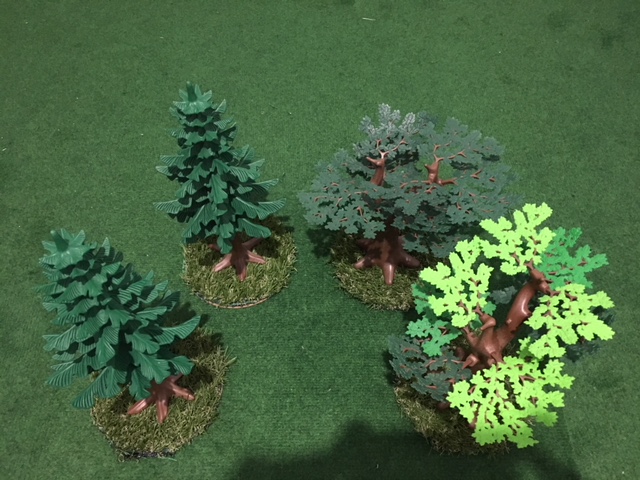 Die großen Bäume habe ich erstmal auf runde Platten mit Kunstrasen geklebt (siehe Foto). Mit zusätzlicher Deko (Steine, Geröll etc.) sieht's dann sogar ganz passabel aus (den Kindern gefällt es jedenfalls).