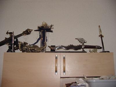 - Das dreier Set Samurei Schwerter steht gegenüber! Auf einem Ständer in Scheiden. Da sieht man nicht so viel.