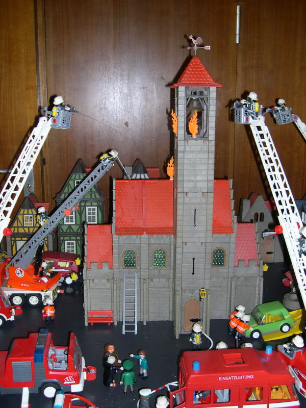 Ein echtes Event: Sirenengeheul, Glocken läuten. Der Turm raucht tatsächlich und echtes Wasser kommt aus den Schläuchen!!!