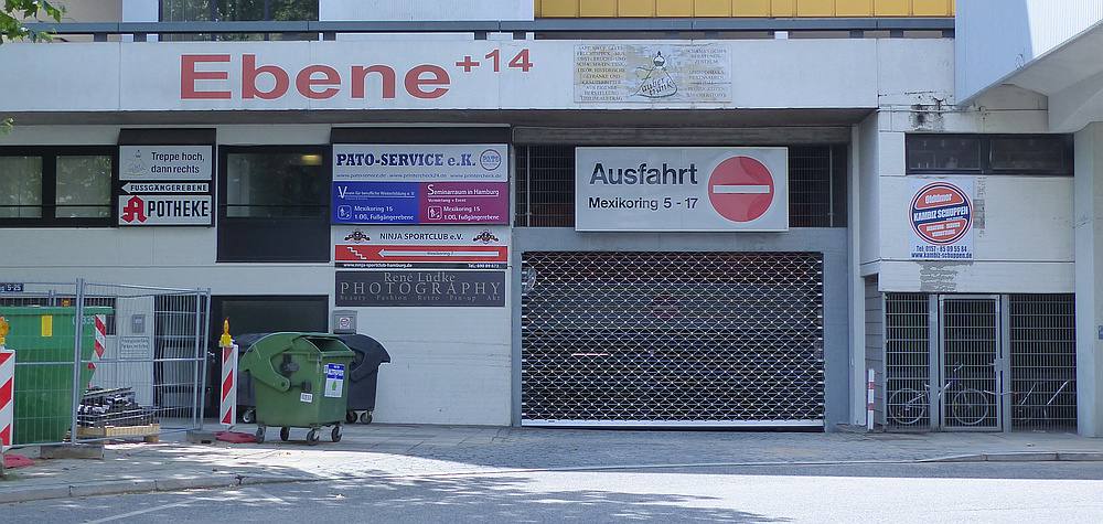 Die Anschrift lautet Mexikoring 21-23 in 22297 Hamburg. Mitten im Mexikoring unter einem Hochhaus befindet sich die Auffahrt zum offenen Parkdeck der KITA, welches wir an diesem Tag mitbenutzen dürfen. Die Schranke öffnet für angemeldete Teilnehmer automatisch.