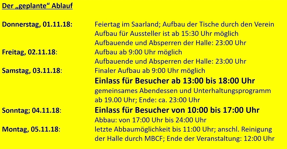 "...sorgen wir für Verpflegung (und Unterhaltungsprogramm) während des Wochenendes in ausreichender Form für alle ideellen Aussteller, Verkäufer und helfenden Hände. Wir versuchen Deine Kosten so gering wie möglich zu halten. Alle Teilnehmer des Steinelandes 2017 (Lego-Ausstellung; siehe http://www.mbcf.de) waren in Bezug auf Verpflegung und Betreuung voll des Lobes. Diese schöne Tradition wollen wir auch beim „playmoland Saar 2018“ weiter fortführen....."
