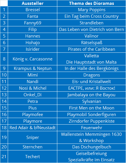 Nach dem 15.12.18 werden wir auf Grund der Themen / Größen auswählen, welche Dioramen gezeigt werden können und voraussichtlich Jan. 2019 hier bekanntgeben.