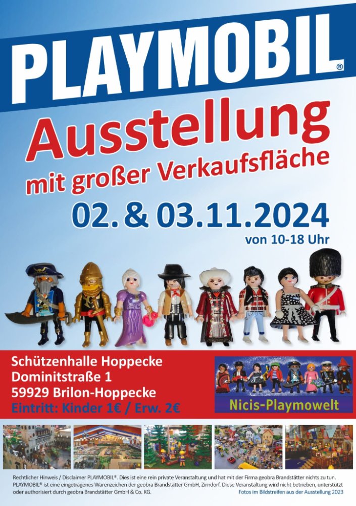 vom 02 bis 03.11.24 gibt es wieder bei Nicole und Thomas in Brilon-Hoppecke die überregional bekannte Playmobil Ausstellung mit Verkauf!!!