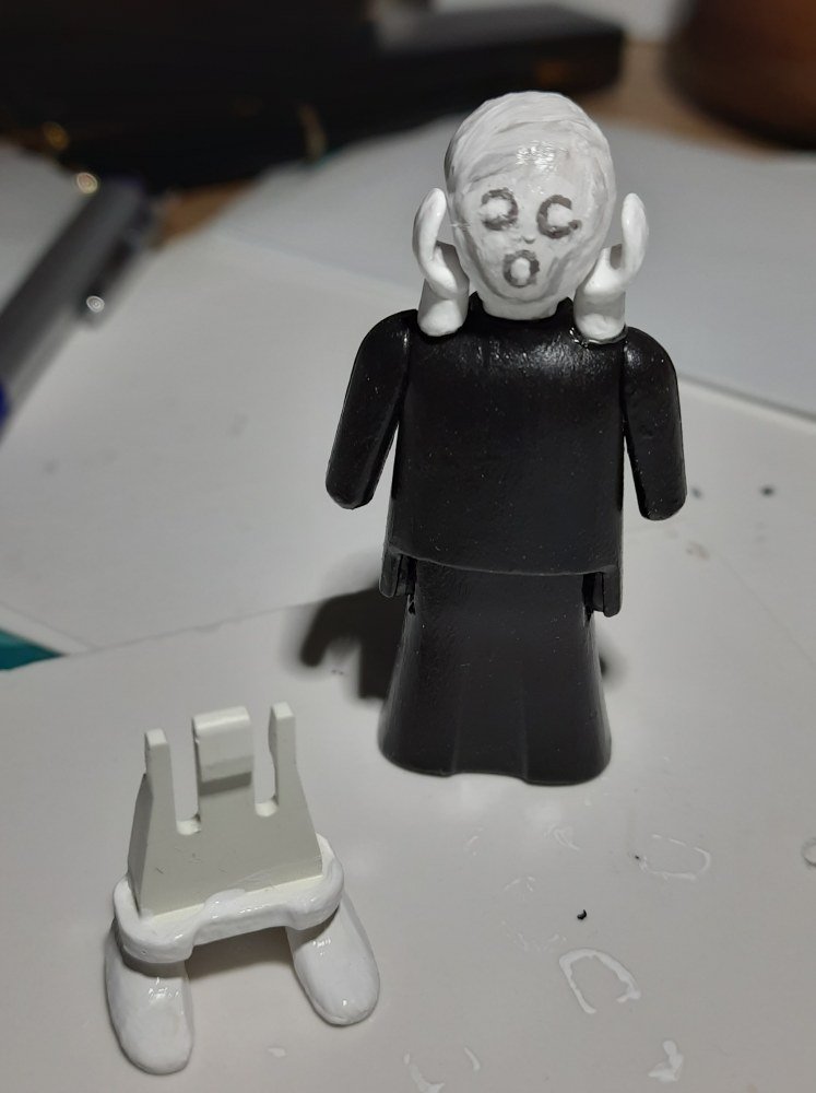 Den Kopf habe ich zunächst gefeilt, dann oben mit Knete das Haupt modelliert und schließlich bemalt.