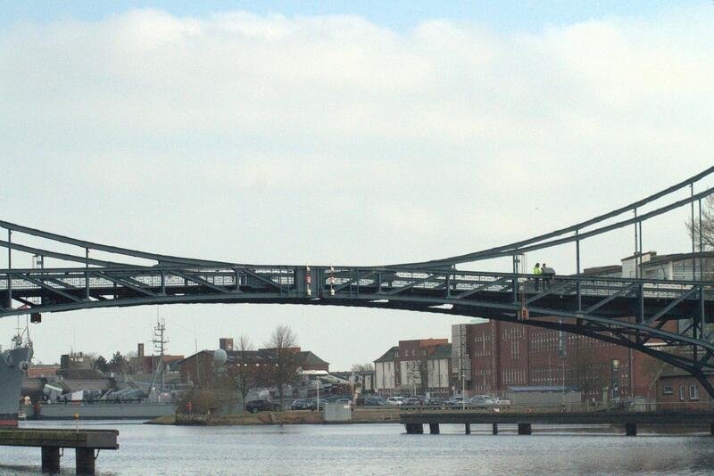 ""Die Kaiser-Wilhelm-Brücke (umgangssprachlich KW-Brücke) in Wilhelmshaven ist eine achsensymmetrische, zweiflügelige Straßendrehbrücke aus genietetem Stahlfachwerk. Sie ist das Wahrzeichen der Stadt Wilhelmshaven.""