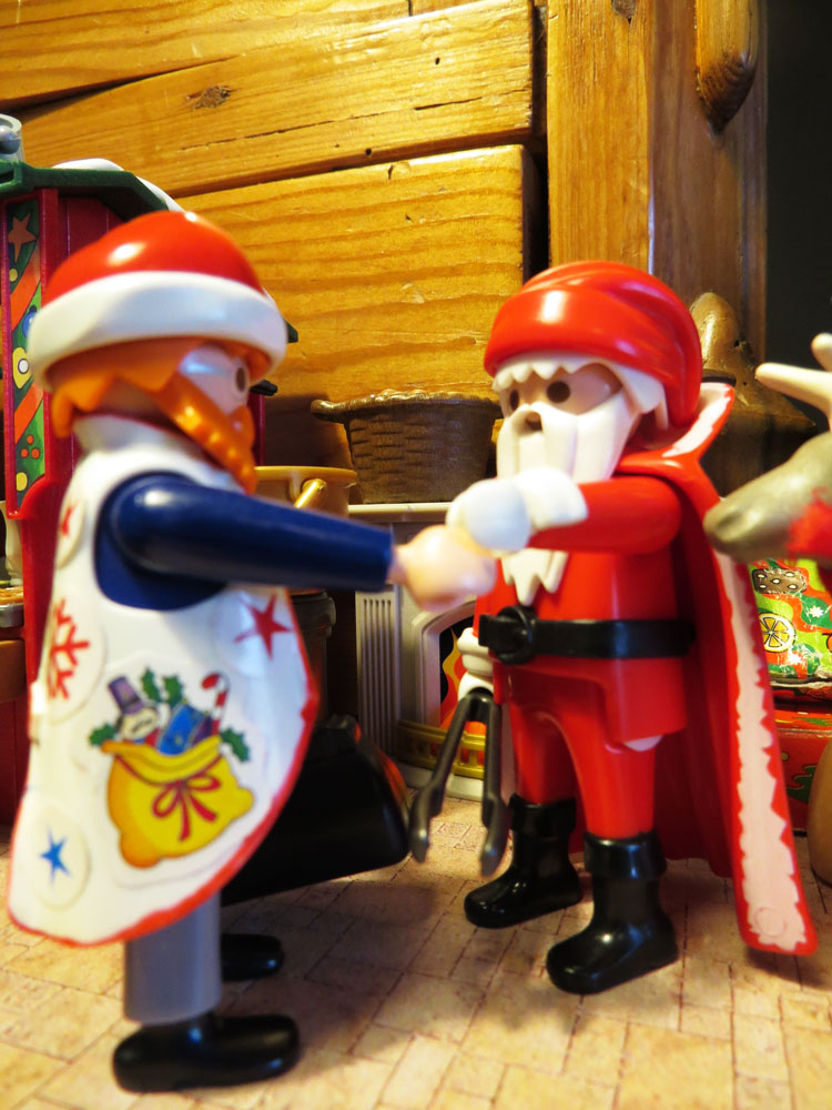 "Mönsch da is ja oach der lütte Flimpi" begrüßt Santa Mick freundlich das Rentier von Santa Hannes, "wie geiht di dat mien seuting Shietbüddel?"