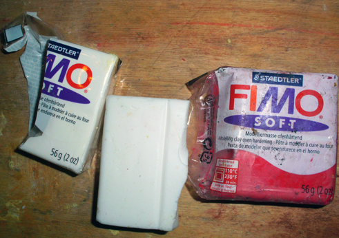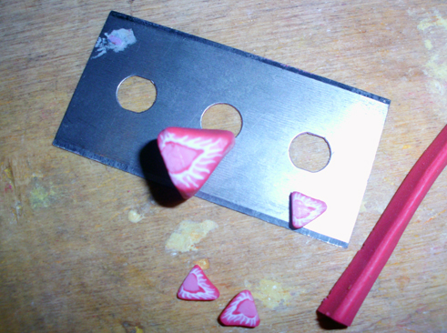 Fimo rot, weiß und transluzent weiß (das sorgt für den glasigen, "saftigen" Eindruck) werden in unterschiedlichen Anteilen gemischt und zu einer großen Form zusammengebaut. Die wird dann je nach Form klein gedrückt, gezogen, gerollt ... und schließlich mit der Rasierklinge in dünne Scheibchen geschnitten.