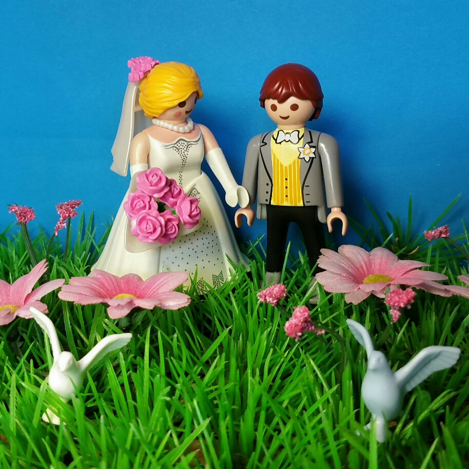 Also das Hochzeitspärchen auf dem Wiesenstückchen sieht doch schon mal hübsch aus. Sehr passend mit den rosa Blumen zu dem rosa Strauß der Braut!