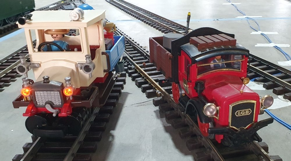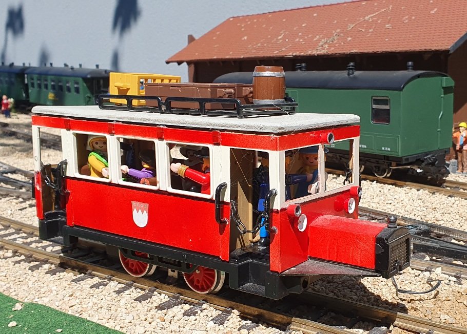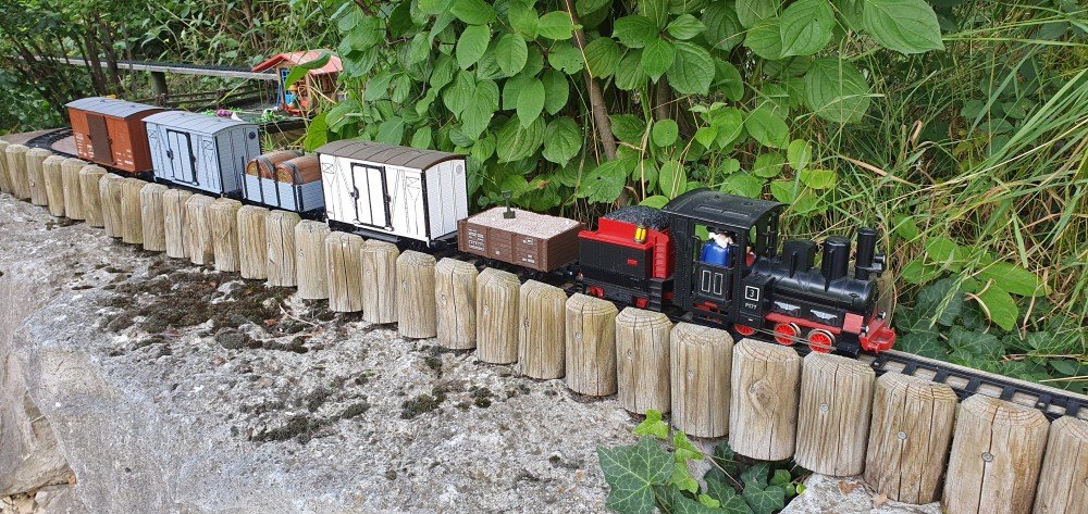 Drei Selbstbauloks: oben eine Garratt in walisischem Dunkelrot - die hatte der Rodibo netterweise mitgebracht. Unten links meine Pt 2/2, auch Bockerl oder Glaskasten genannt. Und unten rechts meine bloß lackierte und sonst unveränderte Dampflok im Photokostüm.