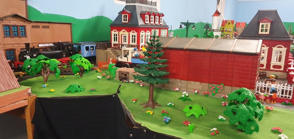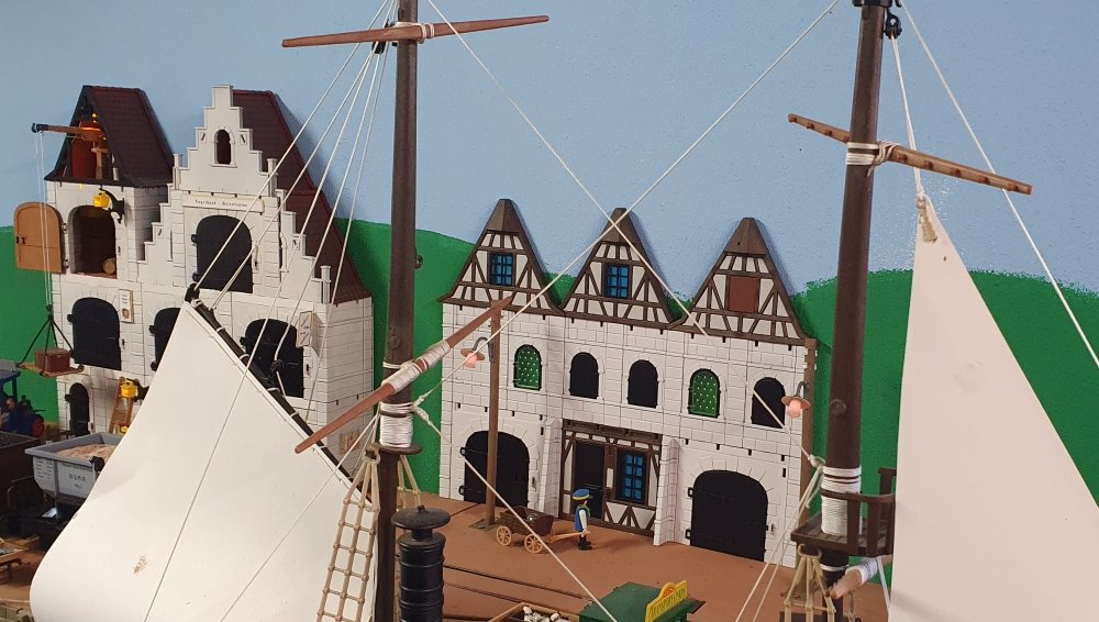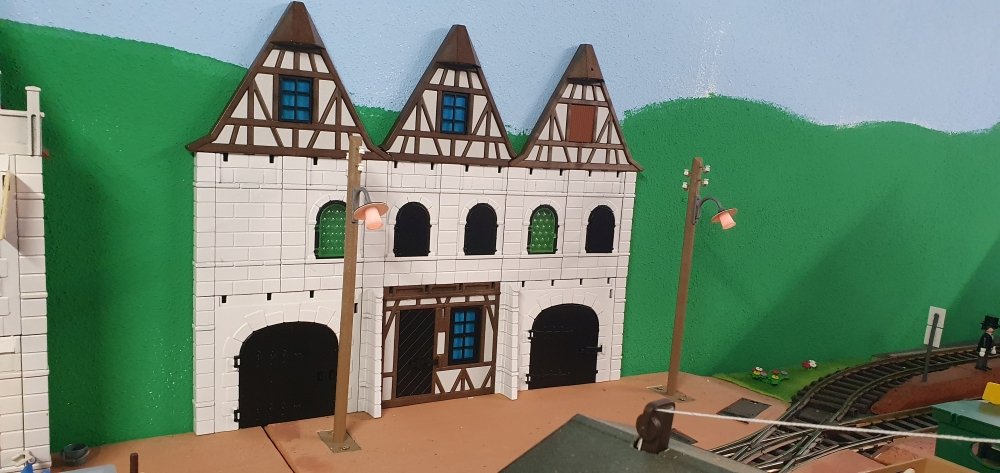 Die Reihnehäuserreihe hat Platz genommen. Die Fenster werden noch hinterlegt. Auch mit Zug davor schaut das gar ned mal so schlecht aus. Und wer's gern bewegt mag, ist hier