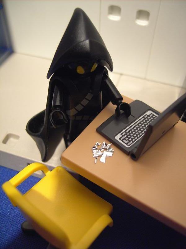 Jedi sitzt vor seinem neuen Laptop aus dem Space-Shop - Windoof inclusive und noch Irgendwas Inside