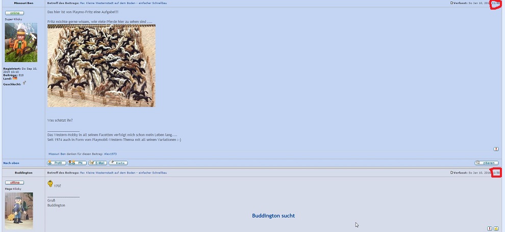 Yelp - coole Idee ... Schade, dass wir da nicht drauf gekommen sind - aber dann wäre es auch wirklich einfach gewesenschirmchen hat geschrieben:Hihi, ihr hättet 4 Pferde mehr aufstellen sollen und dann schreiben können, die Zahl ist irgendwo im Diorama versteckt......