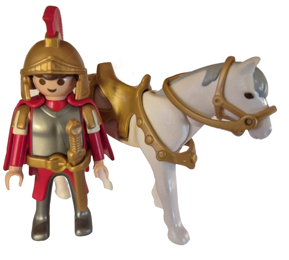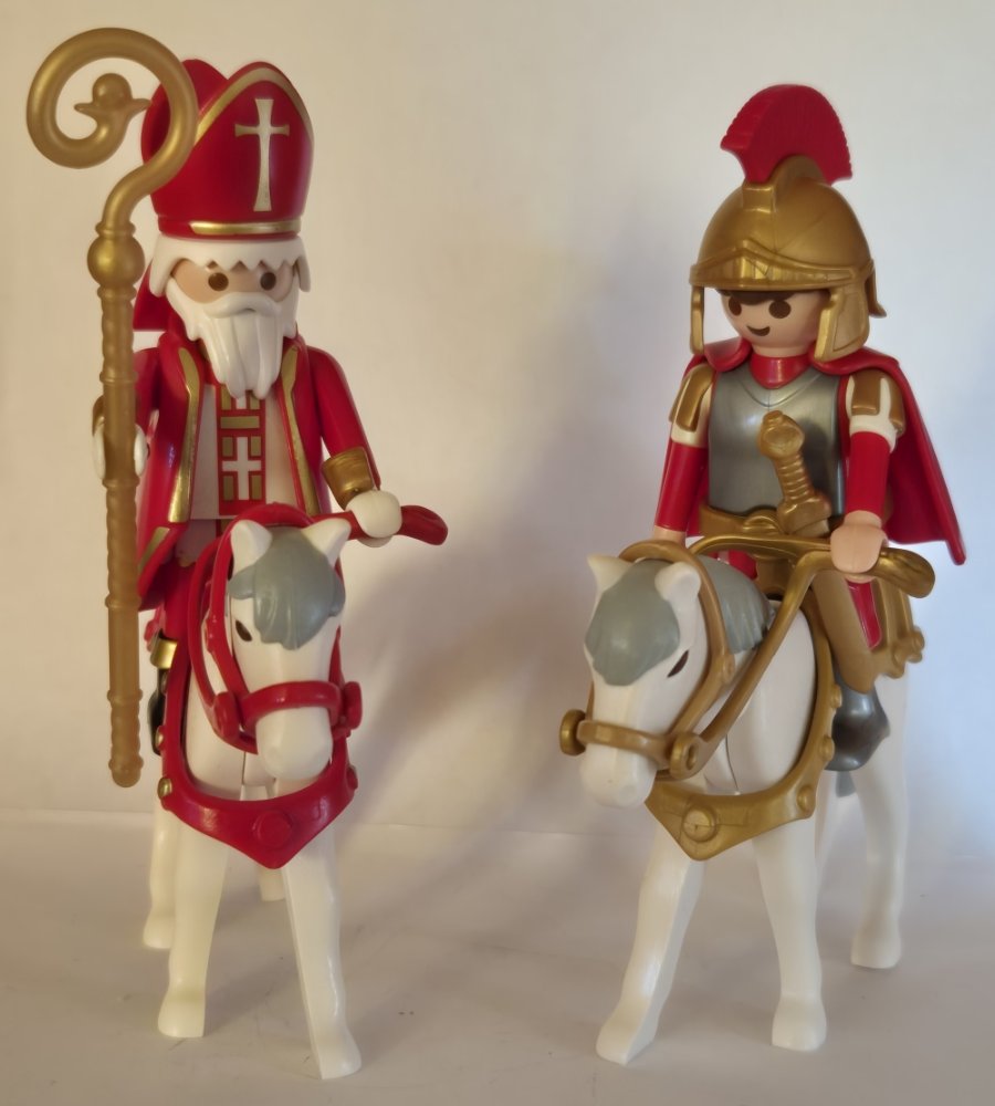 Playmobil hat dem Sankt Martin zwei Figuren gewidmet: Im Set 4409 tritt er als römischer, berittener Soldat auf. Ob Rüstung und Helm so ganz passen, diskutieren wir grad in der Römerecke. Er ist auf jeden Fall eindeutig erkennbar, und dem Set liegt ja auch ein zweiter Mantel für den Bettler bei