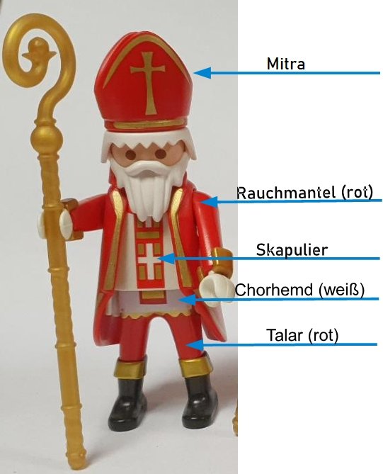 Hier fällt auf, daß St. Martin mit Bischofsstab und -mütze eindeutig die Zeichen seines späteren Bischofsamtes trägt. Im Gegensatz zu den anderen Bischofsfiguren ist bei ihm der Talar (bzw. da die Figur reiten können muß die Hose) nicht in weiß, sondern in rot gehalten. Ein roter Talar ist nun aber (zumindest in der römisch katholischen Kirche) das Amtszeichen eines Kardinals. Da lagen die Designer aus dem protestantischen Zirndorf wieder mal aweng daneben - und da die Figur Reiterbeine und keinen Rock trägt, kann man sie leider auch nicht so ohne Weiteres in einen "richtigen" Kardinal verwandeln