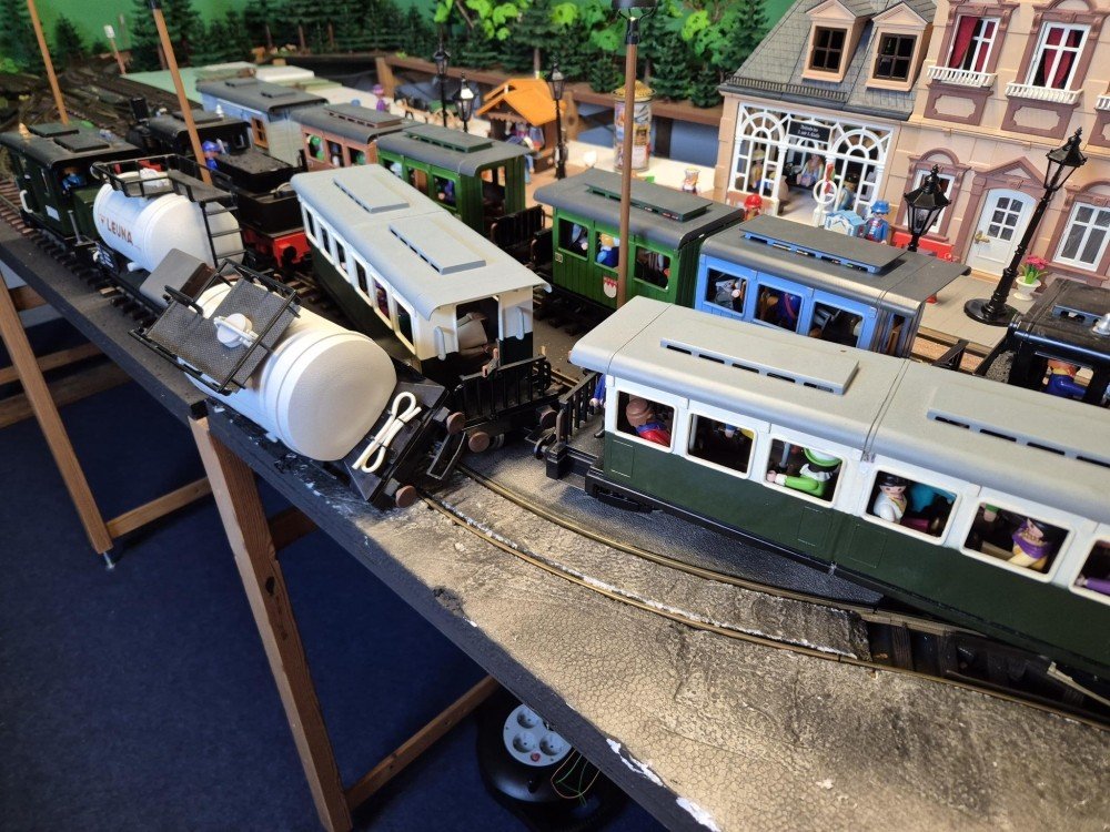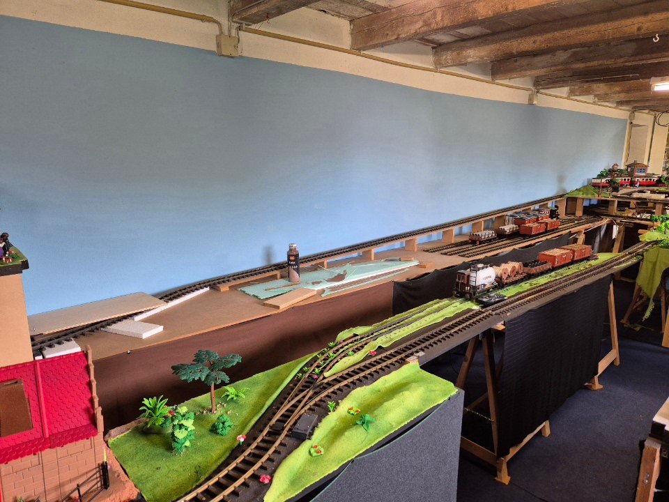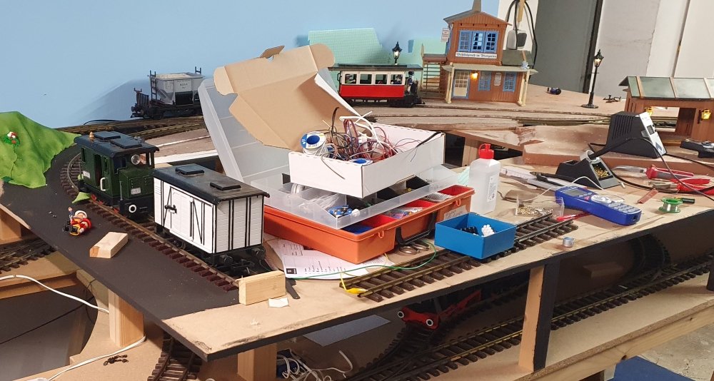 ...und aweng was draufstellen. Fest bebauen geht allerdings nicht, da das Programmiergleis so bleiben soll, daß ich bei Bedarf auch mal eine Lok flachlegen und aufmachen kann.