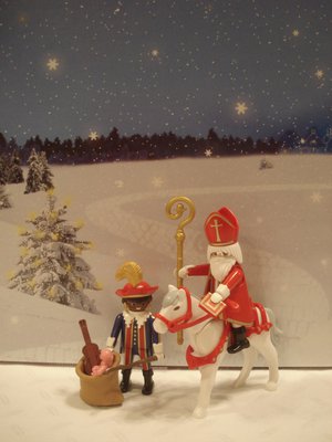 Mit dabei ist der Zwarte Piet. Er ist festlich gekeidet und bringt den Kindern die Gaben.