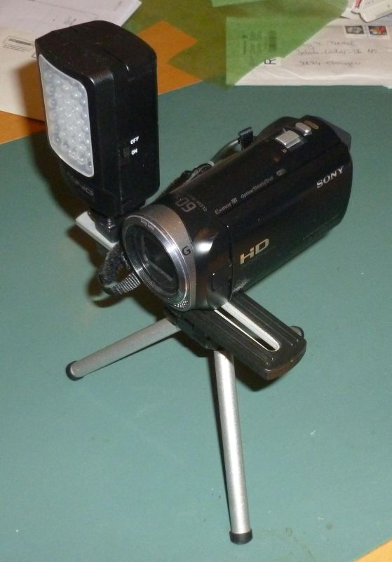 Wenn ich ernsthaft filmen gehe, schleppe ich 3 Stative in verschiedenen Größen (und ein viertes für den Scheinwerfer) mit mir rum. Und selbst wenn ich nur die kleine handliche Sony-Kamera dabei habe, sieht die so aus: