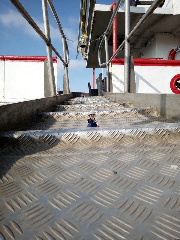 Die Titanik war gerade nicht verfügbar, aber da kennt sie ja nichts und tapert in ihrem windduchfluteten Kleidchen schonmal auf die Gangway eines Ausflugdampfers.