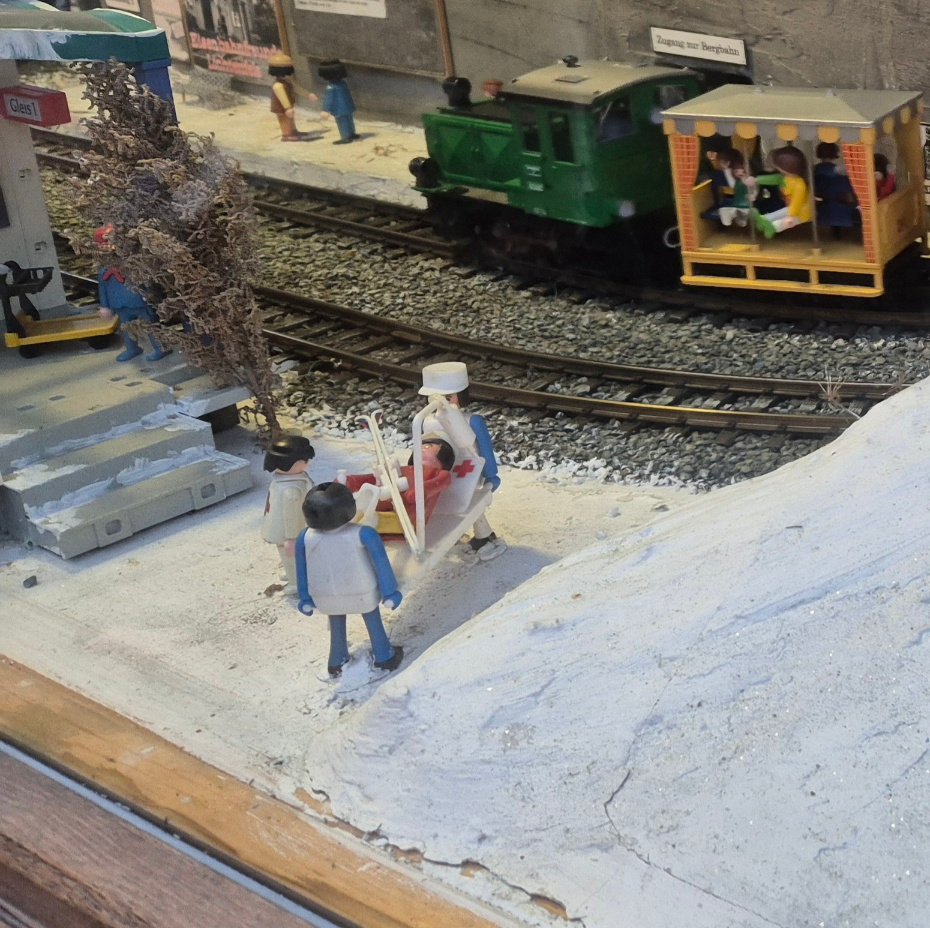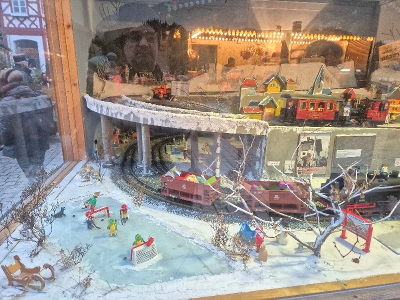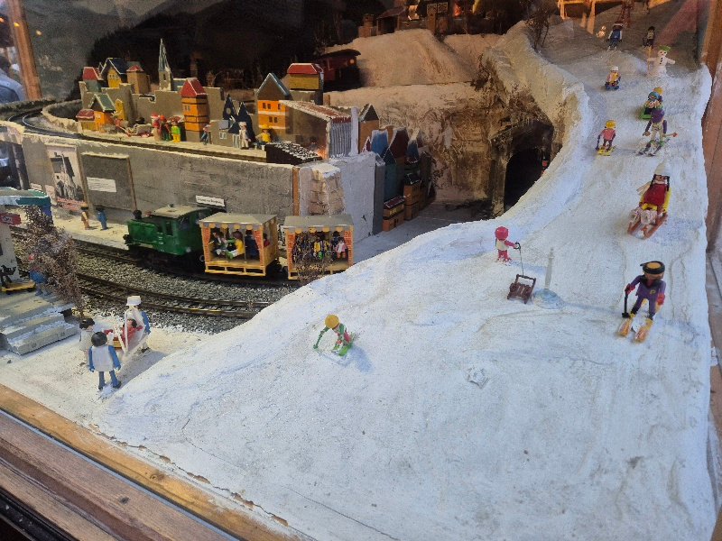 Die Eisenbahnfreunde Lichtenfels haben ein Dio für den Adventsmarkt gebaut. Das ganze atmet den Hauch der Nostalgie, weil sich einige Play Big Figuren mit reingeschlichen haben.