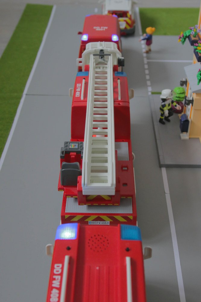 Während die Besatzung der Drehleiter Anleiterbereitschaft herstellt…