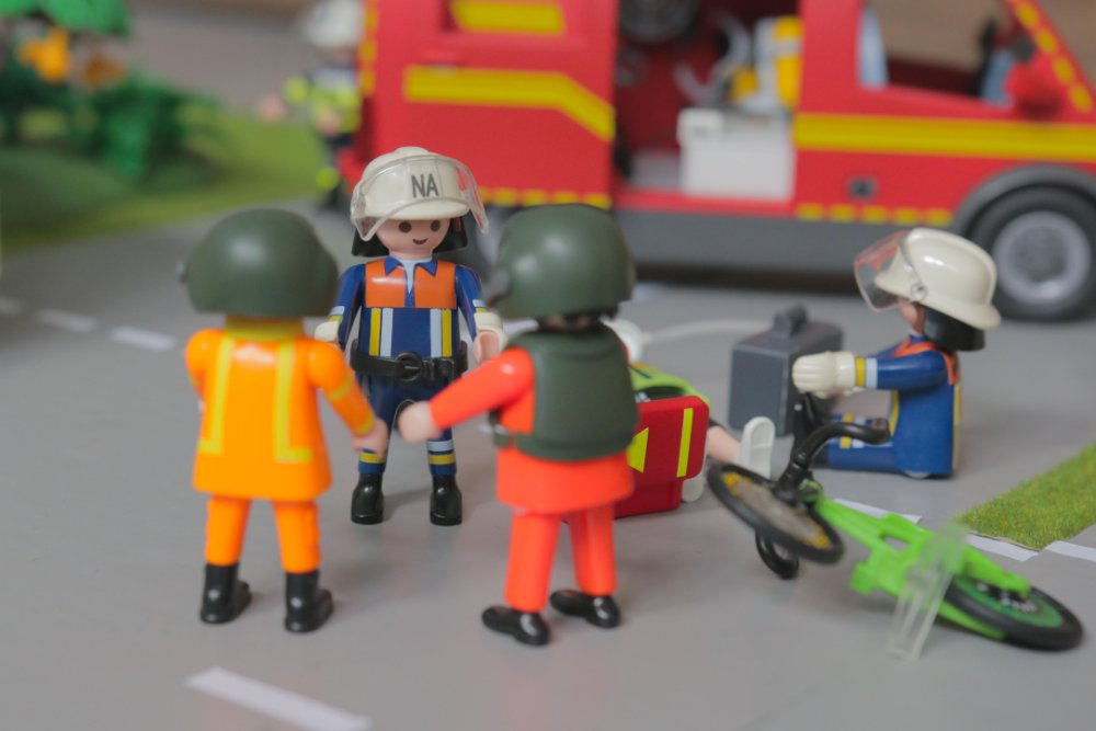 "Hi. Wir haben hier gerade den Blitzer aufgebaut, als das Cabrio viel zu schnell angekommen ist. Der hat wohl den Fahrradfahrer übersehen und ihn dann mitgenommen. Mein Kollege guckt gerade nach dem Autofahrer; der Radler ist bewusstlos, aber atmet."