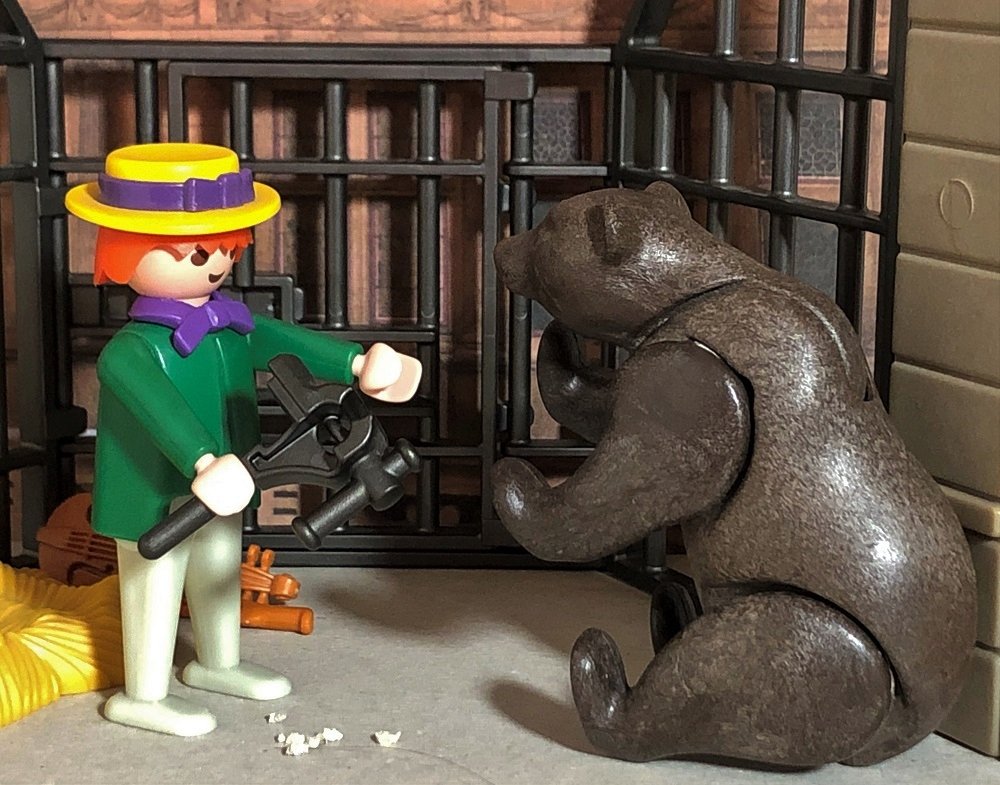 Als nun der Abend kam, ward mein Schneiderlein hinunter zum Bären gebracht. Der Bär wollt auch gleich auf den kleinen Kerl los und ihm mit seiner Tatze einen guten Willkommen geben. „Sachte, sachte“, sprach das Schneiderlein, „ich will dich schon zur Ruhe bringen.“