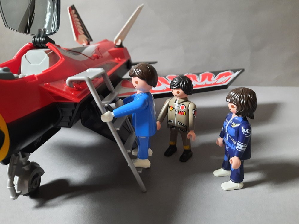 "Wir trainieren heute mit einem neuen Flugzeug.", sagt Alex und deutet auf den roten Jet.