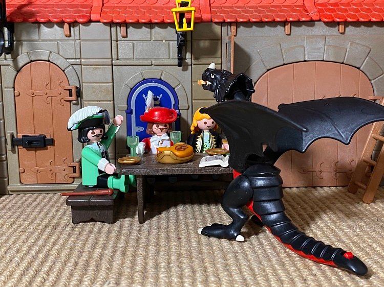Um zwölf Uhr nachts kam der Drache angeflogen und verlangte sein Essen. Die Großmutter deckte den Tisch und trug Trank und Speise auf, dass er vergnügt war, und sie aßen und tranken zusammen. Da fragte sie ihn im Gespräch, wies den Tag ergangen wäre, und wie viel Seelen er kriegt hätte. „Es wollte mir heute nicht recht glücken“, antwortete er, „aber ich habe drei Soldaten gepackt, die sind mir sicher.“