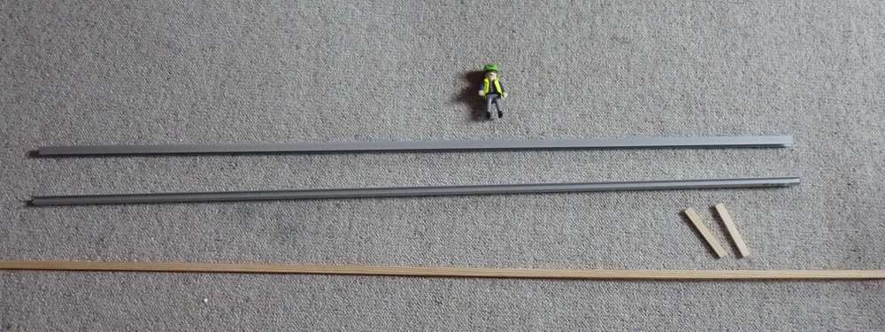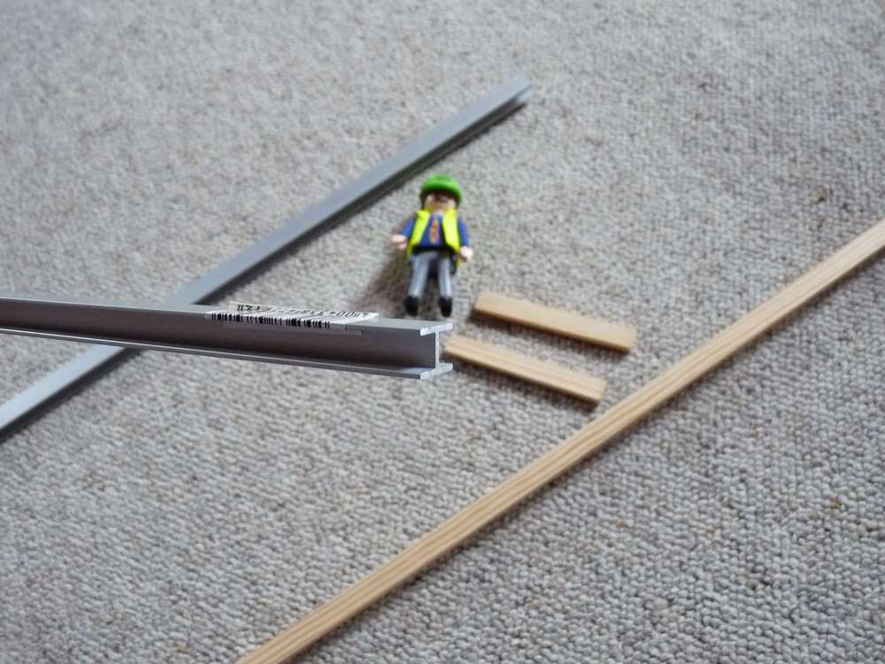 Die Trägerbohlwand besteht aus Alu-H-Profilen und Holzleisten aus dem Baumarkt, Karton und Klebeband. Die Profile wurden rot lackiert(war noch etwas Rostschutzfabe übrig), die Holzleisten (5 Stück) wurden mit einer Mischung aus Plakatfarbe und Wasser bemalt. Immer eine anmalen, dann die Farbe etwas dunkler/heller mischen...dann die nächste usw. Danach sägst Du die langen Leisten(ca.2m) auf die notwendige Länge. Somit erhälst Du viele kurze Stücke, die Du etwas durcheinander mischt und dann auf einen gleichbreiten Karton klebst(doppelseitiges Klebeband). Den Karton mit den Leisten kannst du dann in die Profile einschieben. Fertig!!!