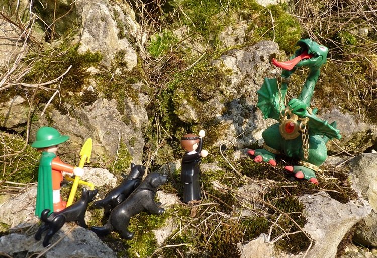 Als sie die Hälfte des Berges erstiegen hatten, kam vom Gipfel herab ein schreckliches Untier mit einem Schuppenleib, Flügel und ungeheuren Krallen an den Füßen; aus seinem Rachen loderte ein glühender Schwefelstrom und schon wollte es sich auf seine Beute stürzen.