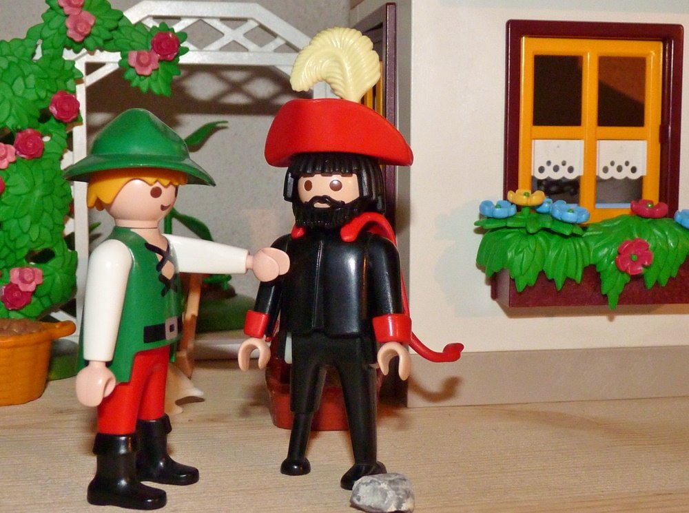 Da trat der Teufel zu ihm und sprach: „Was suchst du? Willst du mich zum Paten deines Kindes nehmen, so will ich ihm Gold die Hülle und Fülle und alle Lust der Welt dazu geben.“