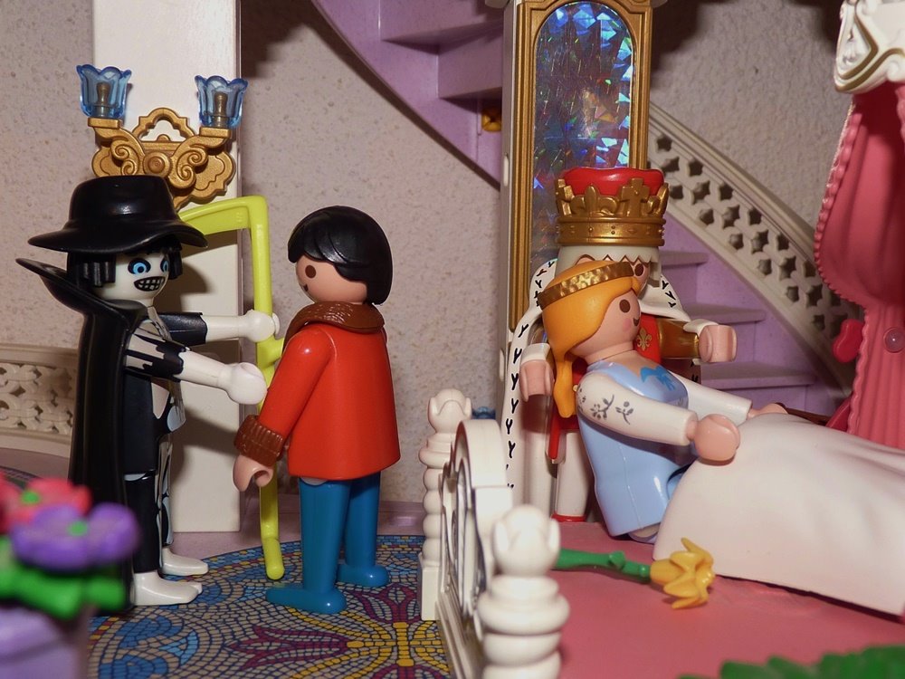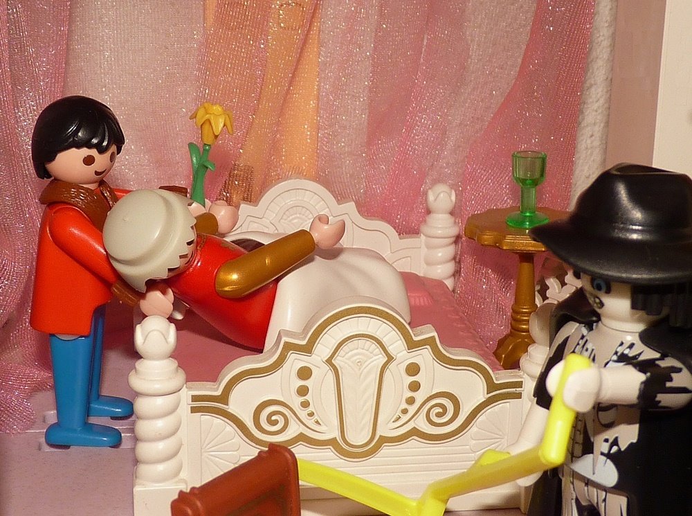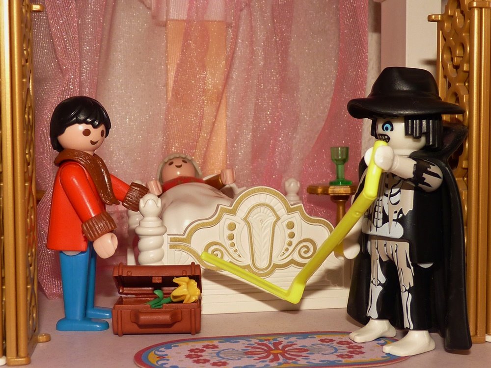 Der Arzt, als er zu dem Bette der Kranken kam, erblickte den Tod zu ihren Füßen. Er hätte sich der Warnung seines Paten erinnern sollen, aber die große Schönheit der Königstochter und das Glück, ihr Gemahl zu werden, betörten ihn so, dass er alle Gedanken in den Wind schlug.