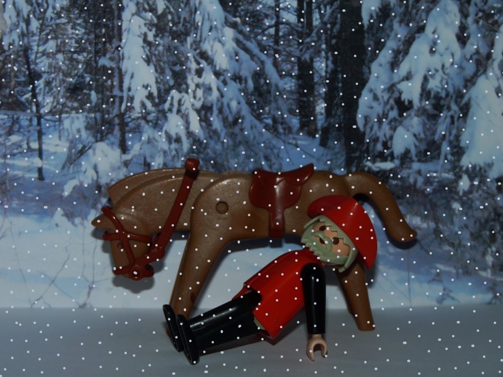 Der Kaufmann brach zu seiner Reise auf, aber am Ziel angekommen musste er um seine Waren einen Prozess führen und nach vergeblicher Mühe kam er ebenso arm zurück, wie er abgereist war. Als er nur noch dreißig Meilen von seinem Haus entfernt war und sich schon darauf freute, seine Kinder wiederzusehen, da musste er einen großen Wald durchqueren und er verirrte sich schließlich darin. Es schneite unaufhörlich und der Wind blies so heftig, dass es ihn zweimal vom Pferd riss.