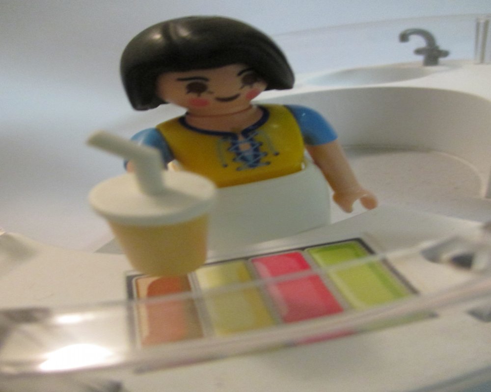 Schließlich entscheidet sie sich für einen großen Smoothie mit Bananengeschmack.