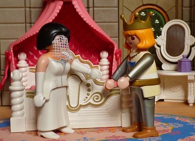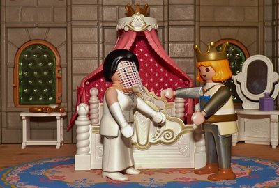 Als die Nacht herankam und die Braut in das Zimmer des Königssohns sollte geführt werden, so ließ sie den Schleier über ihr Gesicht fallen, damit er den Betrug nicht merken sollte.