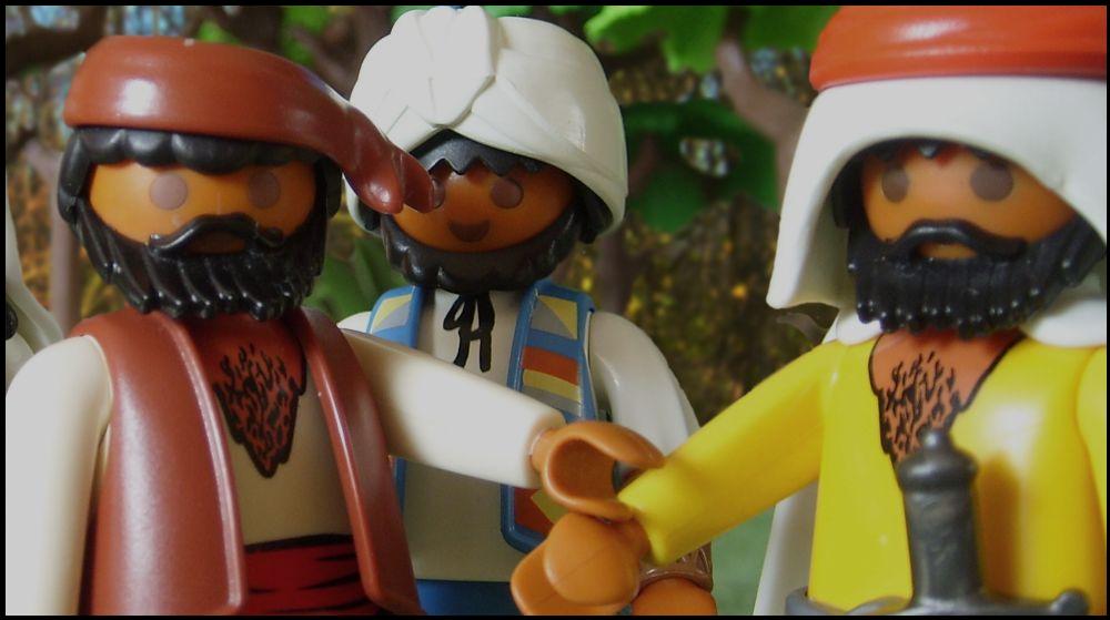 Müde vom anstrengenden Ritt während der Nacht, dem Kampf und dem inzwischen ungewohnt gewordenen Gewicht seines Kettenhemdes versuchte der junge Händler einen Ausweg aus diesem Dilemma zu finden. Er wollte ihre gefährliche Reise nicht noch durch fremde Begleiter belasten. Quälend langsam schlich sich eine Idee in seine Gedanken. „So leid es mir tut, unser Ziel ist...“ Zu Harims allergrößter Verwunderung wurde er von Serabas unterbrochen, „natürlich würden wir uns freuen, wenn wir gemeinsam weiter reiten. So können wir uns gegenseitig Schutz bieten“ Ein strenger Blick des Gelehrten ließ auch seinen Bruder Karabas schweigen.
