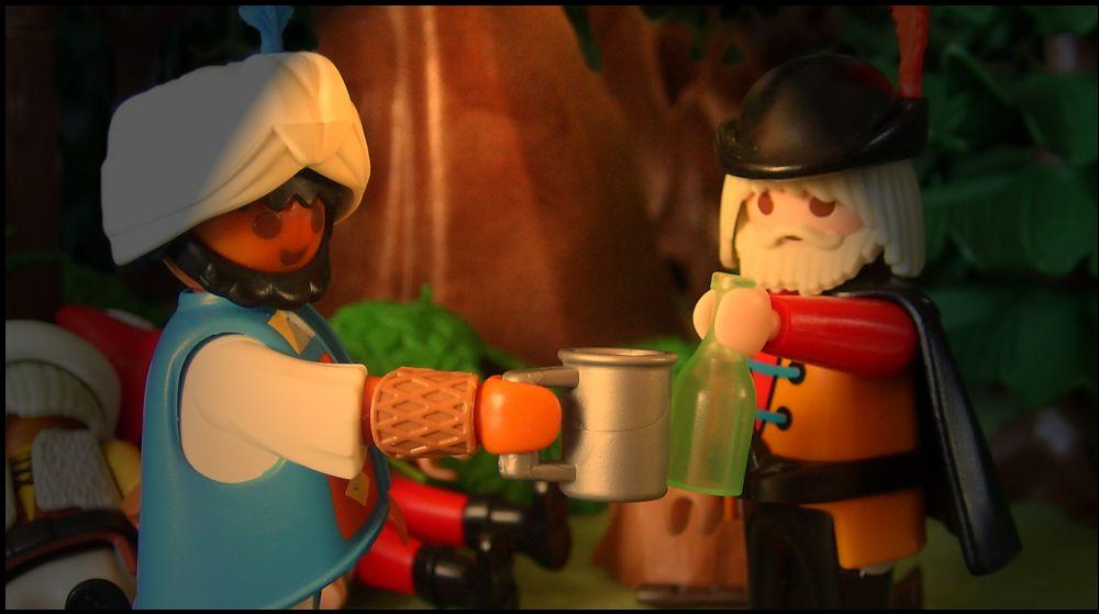 Gerade als er zum Trinken ansetzen wollte, hielt er inne. „Na, was bin ich denn für ein Freund. Ich bitte vielmals um Entschuldigung.“ Mit diesen Worten zog er noch einen Becher aus seinen großen Taschen, warf einen prüfenden Blick hinein, ob er denn sauber sein, und goss etwas von der bernsteinfarbenen Flüssigkeit in den Becher.
