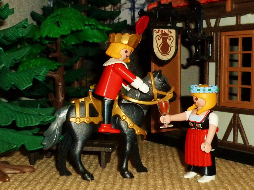 Da heischte er einen Becher kühlen Weins, den brachte ihm die Jungfrau. Der Reitersmann trank aber nicht eher, bis die Maid mit ihren roten Lippen von dem Weine genippt und den Trunk ihm kredenzt hatte.