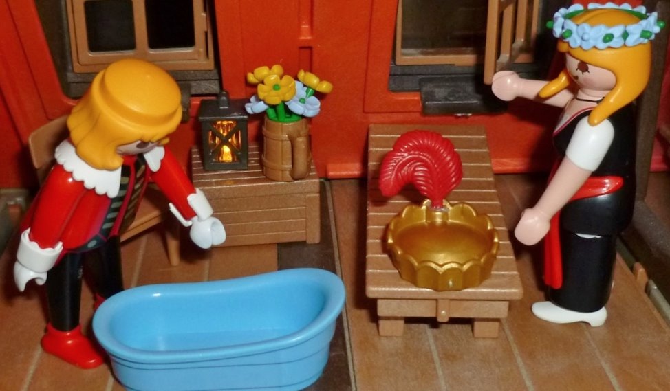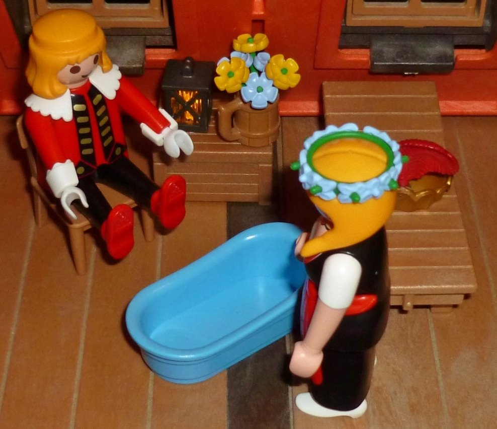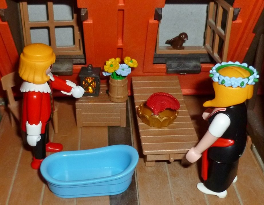 Da erschrak die fromme Maid und grämte sich, rüstete das Bad unter Tränen in dem kleinen Wännelein und trug's hinauf in die Stube, wo der junge Ritter ihrer harrte. Als der sie weinen sah, fragte er: „Warum weinest du, Schönste? Willst du nicht lieber mit mir fröhlich sein?“