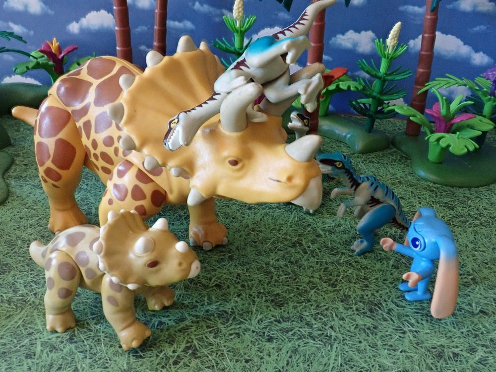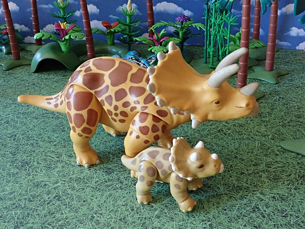 Mama Triceraptops schleudert den Angreifer weit von sich. Das Rudel