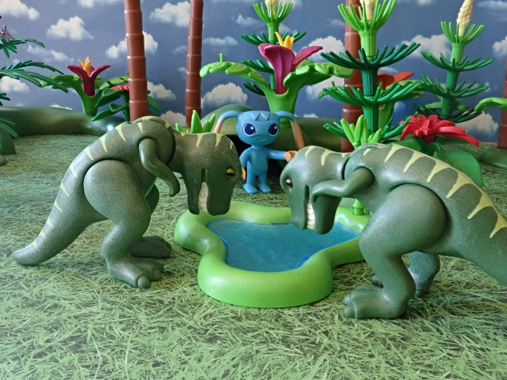 Die Dino schauen sich gegenseitig sehr verdutzt an. Das Ding sieht